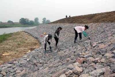 5月28日,施工人员在黄梅县梅济港堤用块石护坡加固堤防。汛期临近,黄梅县全面落实各项防汛措施,组织人员、机械对辖区水库、圩堤、涵闸和河港道等水利设施进行整险加固,确保汛期安全度汛。(视界网 吴志雄 周华玲 )