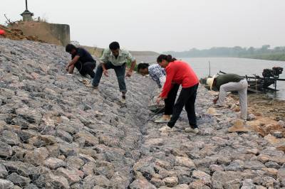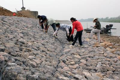 5月28日,施工人员在黄梅县梅济港堤用块石护坡加固堤防。汛期临近,黄梅县全面落实各项防汛措施,组织人员、机械对辖区水库、圩堤、涵闸和河港道等水利设施进行整险加固,确保汛期安全度汛。(视界网 吴志雄 周华玲 摄)