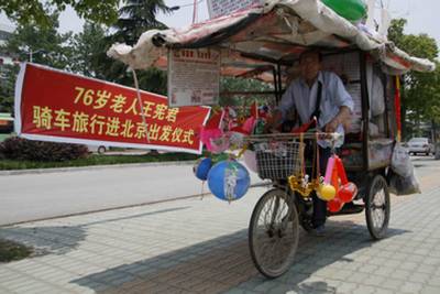天门老汉”低碳”旅行5月27日,湖北省天门市黄潭镇新华村76岁爱心老人王宪君老人在陆羽广场骑着三轮车正式踏上了去北京的旅程。为倡导”低碳”生活,多次为灾区捐款的黄潭镇新华村76岁爱心老人王宪君也加入了骑车出行这一低能耗、低污染的”低碳”旅行行列。(本报视界网刘银斌彭丹摄)