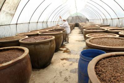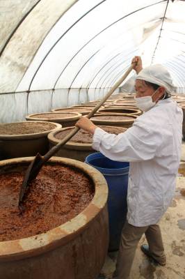5月30日,房县酱园场技术员付玉华在翻晒酱豆。该县的酱豆曾经是唐朝庐陵王流放到房县时最喜爱的一道美味佳肴。自那时起,这个县使用宫廷秘方酿造酱豆的传统延续至今。酱豆来自于房县原产高山黄豆制作而成。从种植、采收、酿造等加工生产环节,无污染,生态化。房县酱豆晒制时间达360天才能上市,酿造出来的酱豆呈酱红色,酱香味纯正,不添加任何添加剂、色素,是餐饮、家庭必备的纯天然调味调色制品。目前,房县酱园场年均销售生态酱豆100吨,产品销往上海、广东等大中城市,也是赴房县旅游的客人选购的特色地特产品之一。