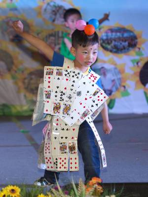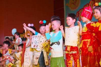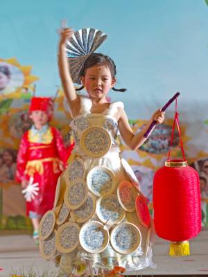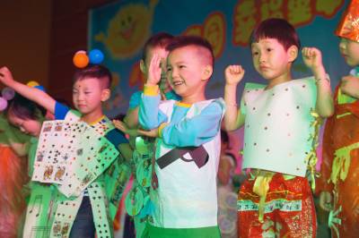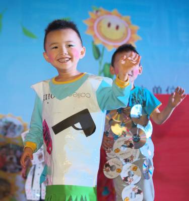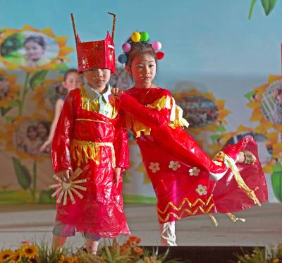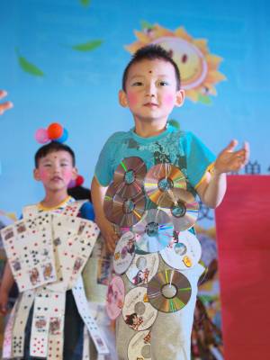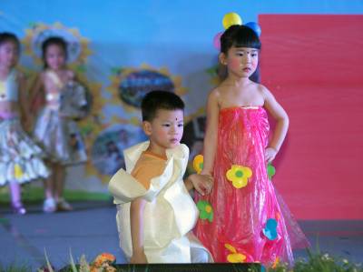 30日,咸宁市咸安区外国语实验幼儿园的小朋友们身由由旧光碟、一次性餐盘、朴克牌、塑料布等材料制成的各种“环保时装”,在“T台”上模仿模特走秀,以此欢庆“六一”国际儿童节到来,倡导节约资源,保护生态环境。