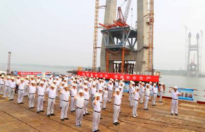 本报荆州讯(通讯员 孟庆虎) 6月1日上午9时,在蒙西华中铁路公安长江大桥建设工地上,中铁大桥局公安长江大桥项目部100余名员工站在施工现场,精神抖擞,举起右手,庄严宣誓:“我是一名中国中铁员工,我工作的安全和质量,关系到企业的发展和荣誉!我郑重承诺:忠诚企业、恪尽职守、珍爱生命、铸造精品!我坚决做到:遵守规章制度、遵守规范规程、遵守劳动纪律、不出事故、不出次品、不留隐患!我将以实际行动,确保企业生产安全、产品优质!”