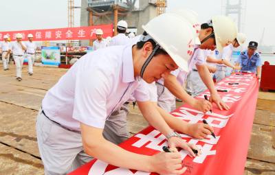 江水滔滔,誓言如潮。员工们的豪情誓言如潮水般回荡在长江上空。标志着公安长江大桥项目部“安全生产月”活动拉开帷幕。
