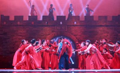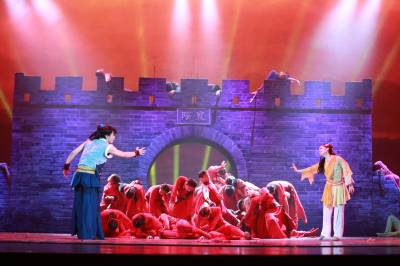 当道具“城墙”以及城墙上“襄阳”两字在第六幕的幕布缓缓打开显现出来时,观众的掌声最热烈。当看到侠义英雄镇守襄阳城的悲壮画面时,坐在前排座位的王女士眼里涌出了泪水,她被剧情深深感染了,“70”后的王女士曾是当年万人空巷看83版电视剧《射雕英雄传》的一员,而今欣赏着用另一种艺术形式表现的《射雕英雄传》,她有了别样的深刻体验。