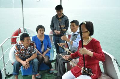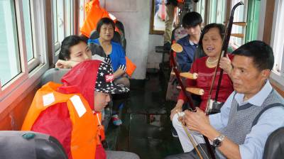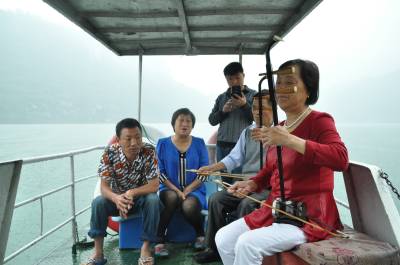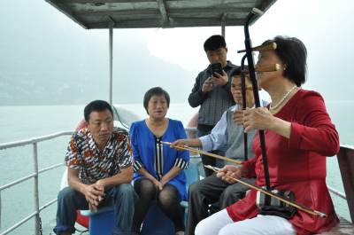 6月4日,李春章两姐妹正在游船上为游客用二胡伴凑山民歌。家住巴东县金果坪乡集镇,年过古稀的李春章两姐妹自幼就钟爱歌舞,妹妹李应章会唱上百首山民歌,姐姐李春章擅长二胡伴凑,年轻时,劳作休息时,姐妹俩站立田头就为乡亲们唱上两段提提神。清江蓄水后,两姐妹的特长有了用武之地,每当有游客来,两姐妹就拉着外甥李坤林,携带心爱的二胡,登船为游客奉上几曲土家山民歌,跳上几圈摆手舞,用歌舞向游客推介金果坪的红色旅游,介绍清江的美丽风光,让游客领略船在画廊行,耳边乐曲飘的绚丽美景。