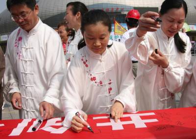 武穴 万人参与宣传环境日 6月5日是我国新环保法实施后的首个“环境日”。湖北省武穴市采取健身项目比赛、书法表演、万人参与签名等一系列活动进行宣传,场面浓烈。视界网冯怡红摄