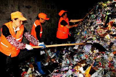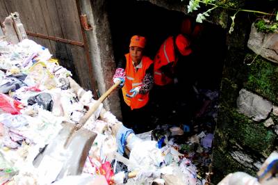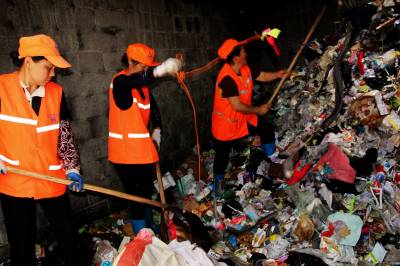 6月5日,宣恩县环卫工人正在将县一中垃圾房内的垃圾进行清运。 据悉:高考期间,该县环卫部门为给考生营造一干净舒适的考试环境,增加清运频次,落实专人负责,对校内考场垃圾房及周围超出平时三倍之多的垃圾量进行及时清理,实行24小时保洁。 (本报视界网:罗清峰摄)