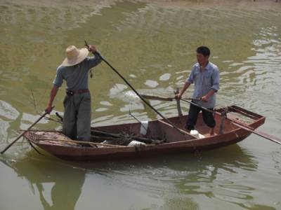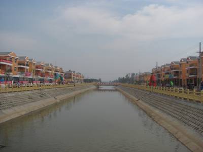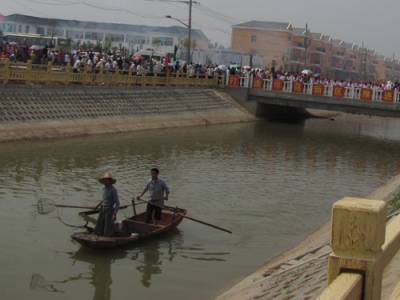 5月24日,郧县最后一批试点移民迁入团风县,两位团风农民划着小船,将街中河道的垃圾清理得干干净净,以此表示对郧县移民的欢迎。