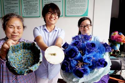 6月5日是第44个世界环境日,鄂州市凤凰街道莲花山社区举办废旧物品改造大赛,“践行绿色生活”理念。居民们积极将自己用旧毛线做的花束、旧光碟改造的钟表、废扑克牌做的置物篮、废纸盒制成的电池回收盒等作品拿来参赛,并现场交流旧物利用经验,增强低碳生活理念和环境保护意识。图为,获奖的环保达人展示自己的作品。 郑博 摄