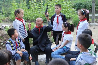 今年是抗战胜利70周年,铭记历史,缅怀先辈。6月4日下午,湖北十堰市郧阳区鲍峡镇余家完全小学三年级的少先队员们,在辅导员老师的带领下,来到离学校不远的水西村三组,听曾经参加过一九四0年枣宜战役的抗战老兵刘胜全老爷爷讲述张自忠将军当年率部抗击日寇以身殉国的悲壮故事,今年九十四岁先后经历过抗日战争解放战争和抗美援朝的刘爷爷,把当年的枣宜战役讲得绘声绘色,同学们一个个听得都入神了,对抗日英烈肃然起敬,孩子们接受了一次生动的爱国主义教育。纷纷表示,一定要倍加珍惜今天来之不易的幸福生活,好好学习,奋发向上,努力成为一个合格的建设者和接班人。