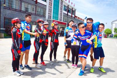 9843青年骑行游客在官庄欢庆喜悦。