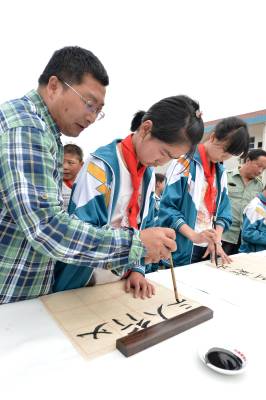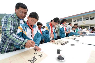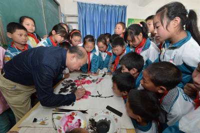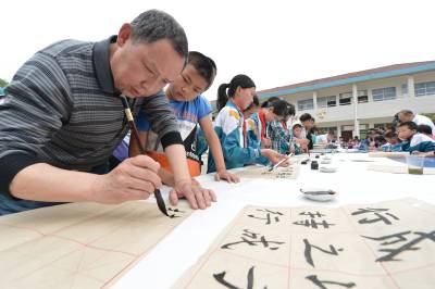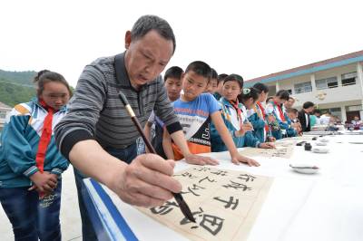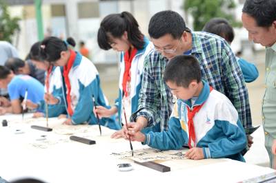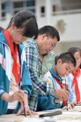 当日,保康县书画家协会十余名书画家到该县歇马镇官斗村小学开展“书画承文化,墨香沁校园”书画家进校园活动,丰富当地农村孩子的精神文化生活。保康县教育系统日前启动以“传承传统文化精粹,培育诚信厚德品质,提升校园文化品位”为主题的“中华优秀传统文化进校园”系列活动,分批次组织当地书画名家、民间艺人等走进中小学校,向学生传授书法、美术、剪纸、泥塑、皮影戏等传统文化知识,引导学生了解传统文化,激发学生对传统文化的热爱,将优秀传统文化的精髓渗透到学校的素质教育中。 (视界网 杨韬 范友森 摄)