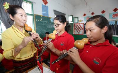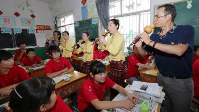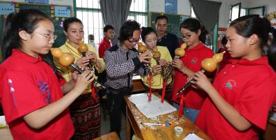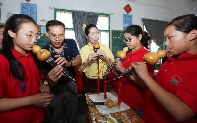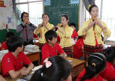 6月9日下午,在湖北省襄阳市襄州区石桥镇一中,来自“中国葫芦丝巴乌总群”的襄阳葫芦丝爱好者为学校留守儿童上了一堂生动的葫芦丝课。
