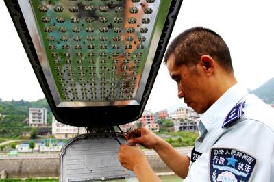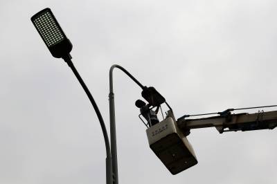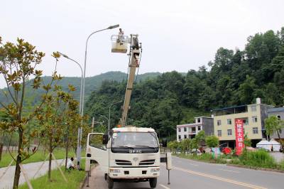 6月9日,宣恩县城市管局市政工作人员正在对莲花坝工业大道抢修受灾路灯。 据悉:连日来,宣恩县城市管理部门组织工作专班对城区,多条人行道及广场因受日前强降雨和雷电影响损坏的24盏“眨巴眼”、“瞎子灯”路灯全部进行检修、更换和及时恢复。 (本报视界网:罗清峰摄)