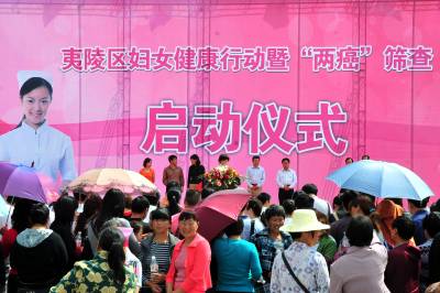 2010年5月28日,湖北省宜昌市夷陵区妇女健康行动暨”两癌”(乳腺癌和宫颈癌)筛查活动启动仪式在黄花乡举行,300多名农村妇女在现场得到该区妇幼保健院28名医护人员的免费健康检查。此次筛查活动投入经费概算为923万元,妇幼保健医生将历时19个月,深入到全区180多个村,免费为25-70岁的已婚妇女提供妇女病检查暨”两癌”筛查,为全区17万农村妇女减轻约4200万元的健康检查费用。