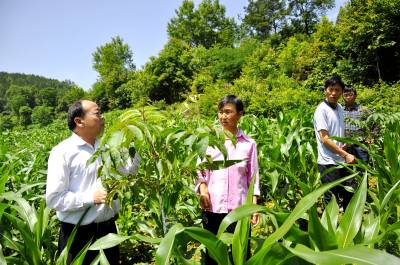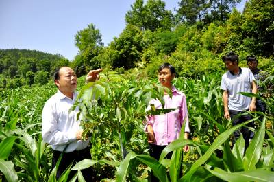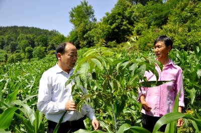 6月11日,在恩施市红土乡稻池村绵羊口组,林业技术员正在指导农户对漆树苗的田间管理。