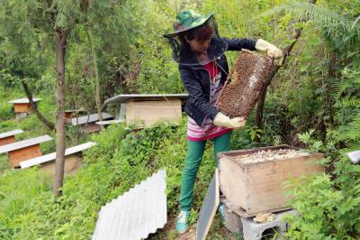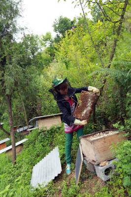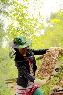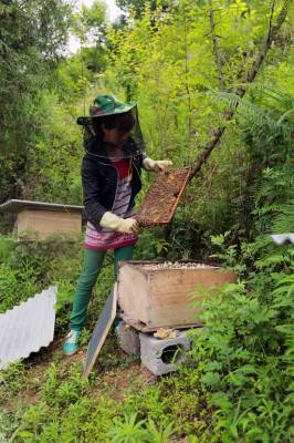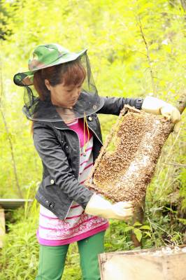 高小苇:林下养殖土蜜蜂致富 13日,高小苇正在查看蜜蜂生产情况。今年30岁的高小苇,是巴东县官渡口镇一位农村妇女。她注册“巴东县薇薇养殖专业合作社”,从2013年起开始林下生态养殖土蜜蜂,成了当地“女蜂王”。今年养殖土蜜蜂64群,可收入5万元。(视界网穆世祝税典松摄)15335850858