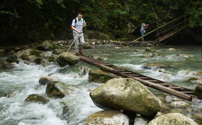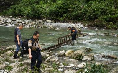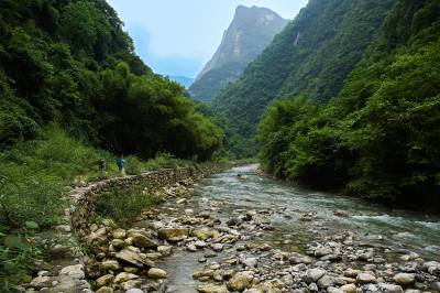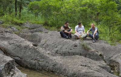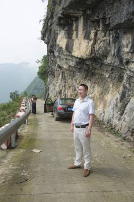 2015年6月9日,几位游客正在建始县景阳瀑布风景区观赏瀑布奇观。