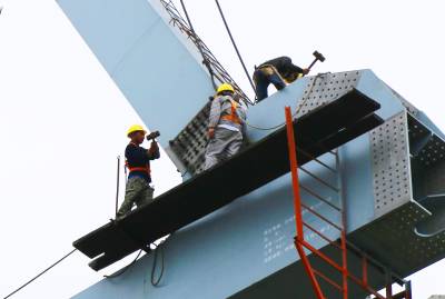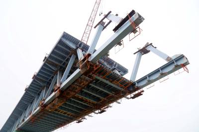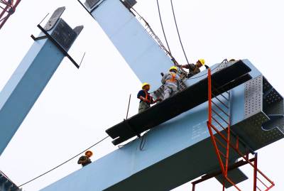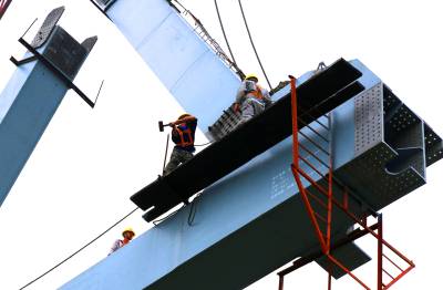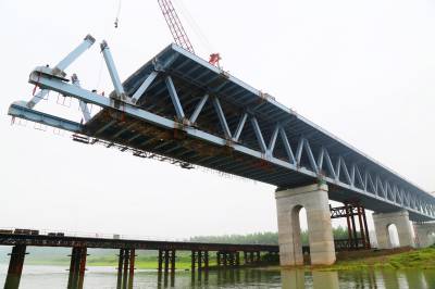 由于近期雨水多,给施工带来诸多困难,工人们抓住晴好天气快速施工,确保了钢梁架设安全质量进度稳步推进,预计8月中旬全部完成连续钢桁梁的架设任务。