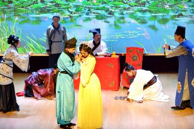 建东花鼓戏又叫灯班戏,起源于战国时期楚国的歌乐舞,形成于140年前的清同治年间。后经清光绪、民国盛行传承至今。因其戏班出自屈原故里秭归县归州之东的建东乡(今秭归县茅坪镇)而得名。2013年10月,《秭归建东花鼓戏》成功入选湖北省第四批非物质文化遗产名录。为更好地传承与保护该剧种,今年初,秭归县非物质文化遗传保护中心、屈原艺术团与茅坪镇文化站开始着手打造一台完整的传统剧目《一女许三家》。该剧讲述了美丽的采莲女张丽英与书生李俊生曲折的爱情故事,演员们精彩的演出很好地传承了该剧目插诨打科、诙谐幽默的特点,受到了观众的好评。