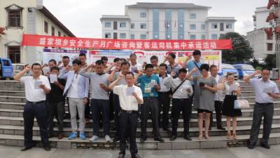 上午9时,在盛家坝乡广场开展的“安全生产月”咨询活动中,富盛客运公司村级驾驶员向人们展示了文明行车,并向社会进行了“五不两确保”的公开承诺。