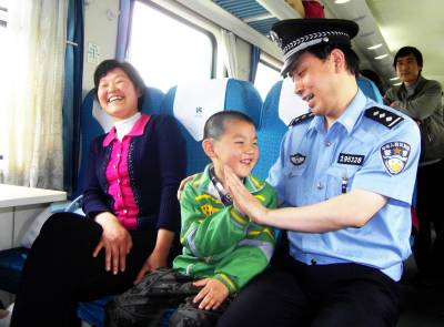 【荆楚网签约摄影师罗超】”六一”儿童节到来之际,襄樊铁警倡导”关爱儿童平安旅行”活动。5月29日早上7时许,K49次列车宜昌的王金龙小朋友睡觉醒来,在车厢里活跃起来,忽略了旅行安全。乘警立即叫来男孩,回到其妈妈身边,说故事,讲防范,谨防碰伤、挤伤、烫伤,并击掌盟誓,平安快乐喜迎”六一”。图为小朋友与列车乘警愉快地击掌盟誓。