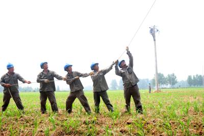 6月19日,在老河口市李楼镇,电力工人正在新建10千伏河岗联线鹤59线路。2015年,老河口市供电公司农村配网建设项目共117个,其中新建及改造10千伏线路127.69千米,新增配变112台,新增容量15620千伏安,新建及改造低压线路172.92千米,总投资金额4800万元,重点解决农村地区低电压和用电卡口问题。