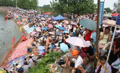 6月20日,湖北省黄冈市武山湖国家湿地公园湖面和官桥大港,来自该市4个镇处的百条龙舟正在比赛,锣鼓喧天,浪花翻飞,在武穴市公安、武警、消防战士冒着烈日坚守下,两岸10余万看客次序井然。公元前278年,屈原投江而死,武山湖一带就有赛龙舟的习俗,一直延续到今天,眼下夏收夏种基本结束,也值传统节日端午节到来之际,农民为了释放一下快乐的心情,同时也是为了纪念楚国诗人、政治家屈原,武山湖沿湖4镇处老百姓自发从杭州和湖南汨罗帆船基地买回百条龙舟,今年的端午节龙舟赛使间断了19年湖区再次热闹非凡!视界网冯怡红摄