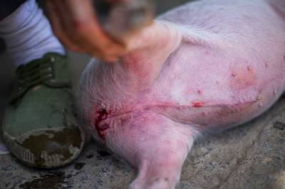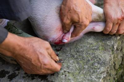 劁猪佬干的其实是目前正规兽医干的活:对需要育肥的已满月的猪仔进行阉割。几乎所有农家的猪——那些未来不能成为种猪的公猪(俗称牙猪儿)、母猪(俗称奶尖儿)只有经过阉割才能一门心思长膘添肥。劁猪佬配备很简单:一把山羊角作成的号角,长约六七寸;一只皮夹子里面装着精巧的劁刀,还有缝合线。具体操作时,他吩咐主人家将猪仔牢牢按住,然后对准需要阉割的部位进刀:对公猪割除睾丸,对母猪摘除卵巢。前后费时不过一分钟左右。公猪的创口不需要缝合,母猪的创口则需要棉线缝合。对创口均不消毒,都能自行痊愈。让人不可思议的是,尽管伤口不小,事后不消毒却从未出现过感染。这里面估计隐蔽着某种“自然密码”。按本地风俗习惯,劁猪佬事后会将阉割下来的睾丸抛上主人家的房顶,同时口中念念有词:“甩上屋,长上三百六”。也有的主人家将这杂碎当作下酒菜,据说吃啥补啥。乡村还有一种对劁猪佬的怪异说法,即农家的狗可能是出于对猪们的同情,往往对劁猪佬有种天然敌视,见到劁猪佬特别咬得凶;即使劁猪佬自家的狗,对他也是相当冷淡,避而远之。
