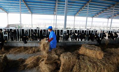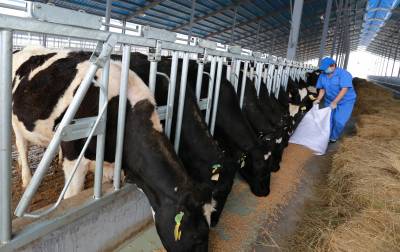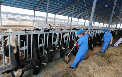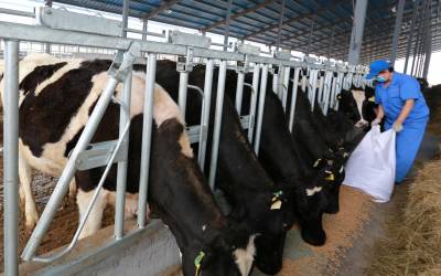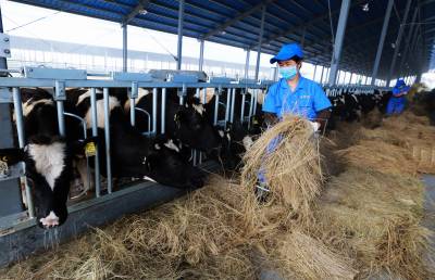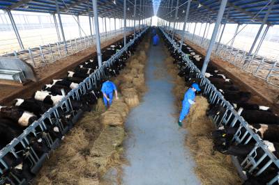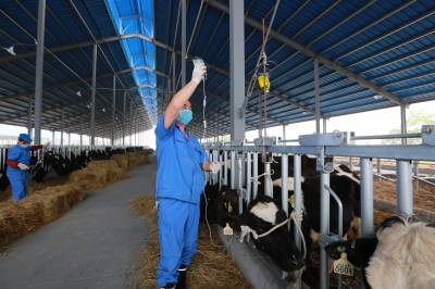 6月22日,,在位于竹山县麻家渡镇店子街村的润泽农牧万头奶牛标准化养殖基地,工人们正在忙碌着给奶牛喂饲料、消毒防疫。该项目属国家重点支持的放心奶工程,总投资4.5亿元,总占地面积780亩,一期建设380亩。已投资1.2亿元,首批引进500头智利荷斯坦良种奶牛,目前直接或间接为当地群众提供500余个就业岗位。