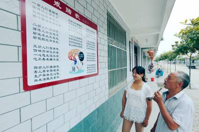 哪个赌汉有好结果? (图文) 6月23日下午,竹山县宝丰镇曹家湾村二组村民正在观看本村“生育文化园”壁画《戒赌歌》。近年来,该县在全县各村、社区启动以“文明·和谐·幸福”为主题的“生育文化园”建设,注入新型文化内涵、传播精神文明建设、计生政策法规、优生优育知识、婚育新风、婚育文明理念,彰显和谐、温馨、人性化的人口文化宣传氛围,为全县人口计生宣传教育传递正能量。