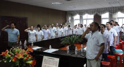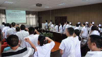 (焦进摄)“我们应以人为本、敬畏生命、善待病人,自觉维护医学职业的真诚、高尚与荣耀,努力担当社会赋予的增进人类健康的崇高职责,为此,我们承诺……”,6月25日,盛坝家乡卫生院在喜迎医师节座谈会前进行承诺宣誓。