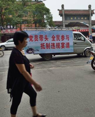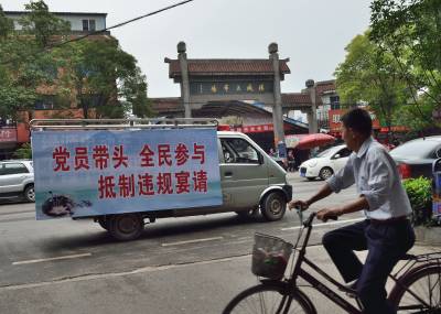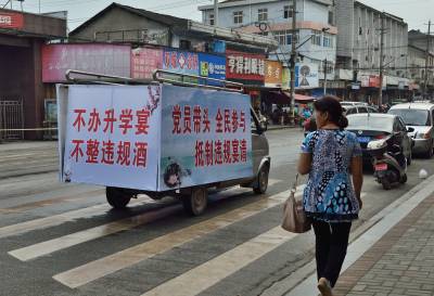 枝城镇预警违规宴请 6月26日,在宜都市枝城镇,一辆宣传车上的喇叭反复播放“抵制违规宴请 倡导文明新风”的有关内容。一年一度的“升学宴”期间,为防止违规宴请反弹,枝城镇组织宣传车广泛宣传上级有关文件规定、倡议书等内容,同时,印发《致高考学生家长的公开信》2000份发放到各村组及高考考生家庭,为节俭办事营造良好氛围。