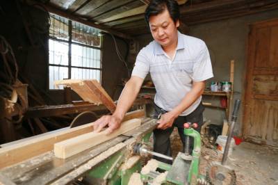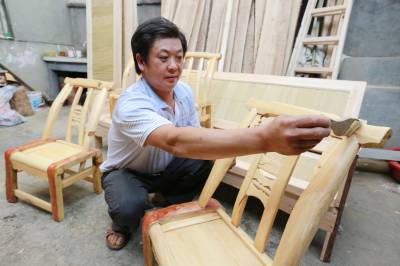 6月27日,竹山县宝丰镇曹家湾村二组潘口水电站移民杨胜兵正在加工官渡木椅。他靠加工官渡木椅老手艺,每年销售官渡木椅300多把、竹床50多张、木质人字梯40多个,成为当地名副其实的移民致富带头人。近几年来,该县出台多项移民扶持政策,加大实用技能培训,引导移民搞好科技致富项目,确保移民移得来,稳得住,能致富,过上幸福生活。