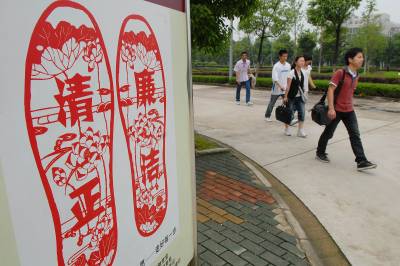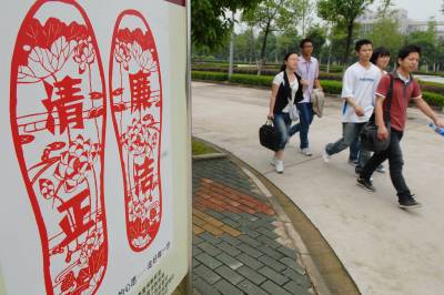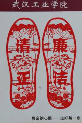 2010年5月29日,武汉工业学院,同学们经过中国剪纸”清正廉洁”文化牌。该校在校园设立丰富多彩的宣传牌,让党风廉政建设成为校园文化建设的一部分,受到师生好评。
