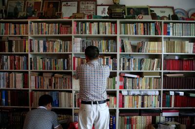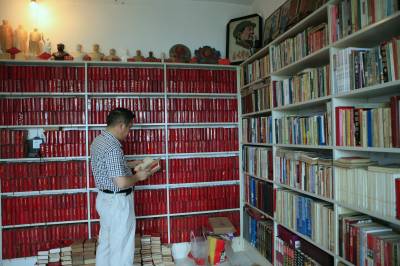展室大约十多平方米,一面临窗,三面都是书柜。深红色的毛主席语录,码满了一整面墙,还占据了另一面墙上书柜的半壁江山。除此外,楼上楼下、卧室客厅堆放着等待整理的报刊图册。