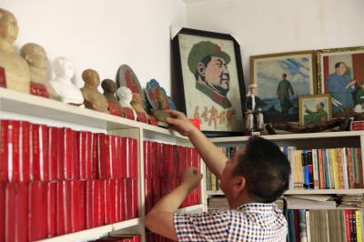 对于每一面墙的书柜上方摆满的大大小小、不同材质的毛主席塑像、画像。王书林介绍,这些都是从宜昌周边收来的,很多是从古玩市场买的,同时收藏来的还有200多个毛主席像章。