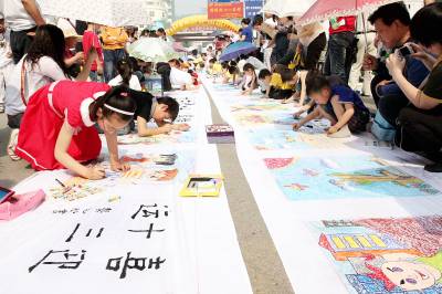 5月30日上午,庆六一迎省运百米长卷少儿书画现场创作大赛在荆门最繁华的中天街举行,200名少儿参加了比赛。在200米长的白色长卷画布上,他们现场创作,用手中的画笔画出运动健儿,写上”荆门加油”,寄托了对省运会的美好祝福和期盼。据悉,本次创作大赛由荆门市委宣传部、荆门市文化体育新闻局、荆门市图书馆等单位举办。视界网签约摄影师朱运兵摄