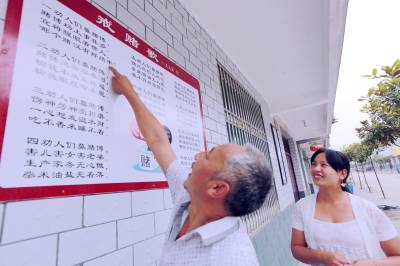 昨日,竹山县宝丰镇曹家湾村二组村民正在观看本村“生育文化园”内容之一《戒赌歌》。近年来,该县在全县各村、社区启动以“文明·和谐·幸福”为主题的“生育文化园”建设,注入新型文化内涵、传播精神文明建设、计生政策法规、优生优育知识、婚育新风、婚育文明理念,彰显和谐、温馨、人性化的人口文化宣传氛围,为全县人口计生宣传教育传递正能量。
