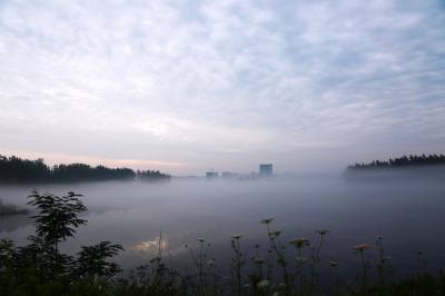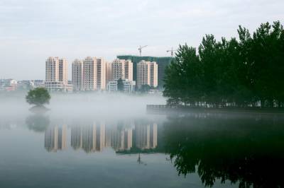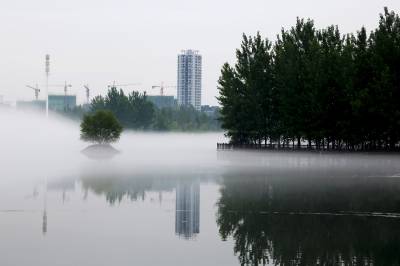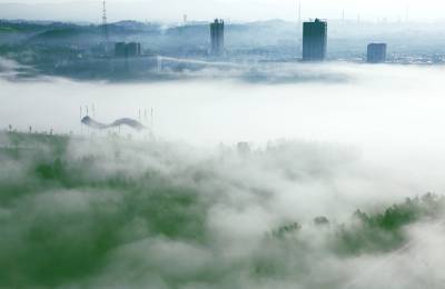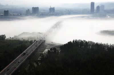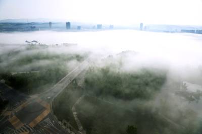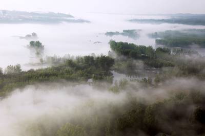 俯瞰一江两岸,起落飘荡的乳白色的雾气,覆盖了整条河面,白茫茫如大海一片。晨雾像柔波在荡漾,一缕缕、一阵阵越过树丛,爬上河岸,淹没了一切,远山被埋葬,几处高楼浮耸于云烟之上。