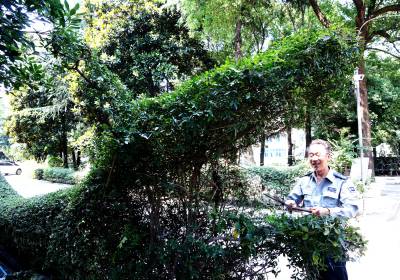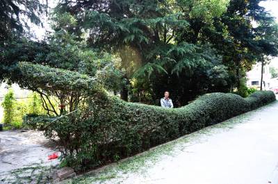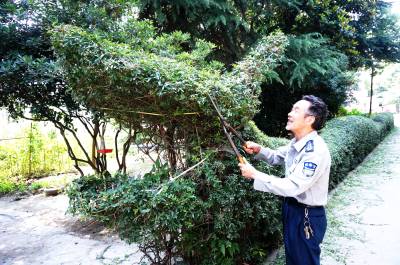 7月7日,十堰市郧阳区水务公司园林工正在修剪近10年打造的长50余米的2条绿篱龙。郧阳区水务公司自1980年建成后,就在占地50亩的厂区空地上载种30多个品种4000多棵风景树朩和各种花卉,精心打造美化、净化、香化、靓化的花园式工厂。 视界网周家山摄