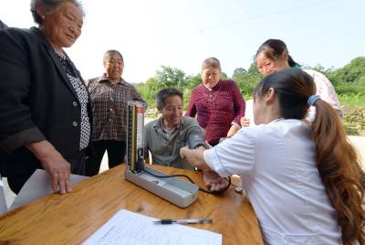 7月7日,医务人员在保康县歇马镇东坪村为村民免费测量血压。