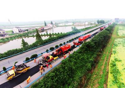 迎国检期间,湖北楚天高速枝江段试点热再生新技术,橙黄色的热再生时代列车,可以100%循环利用路面沥青材料,在原有路面加工软化、翻松铣刨的基础上,经添加、热复拌后就地重铺,形成再生后的道路面层。(赵超 刘俊).