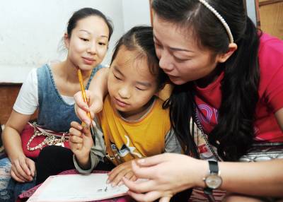 30日,黄石烟草专卖局直属分局”爱心妈妈”曹敏(左一)和刘胜琛(右一)上门辅导贫困小学生柯婉婉练书法。据了解,当日,该分局的6名”爱心妈妈”上门对柯婉婉等三名贫困小学生的学习和生活进行了解,并送上慰问品和慰问金,鼓励她们好好学习。