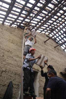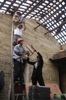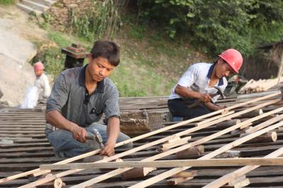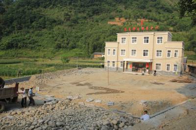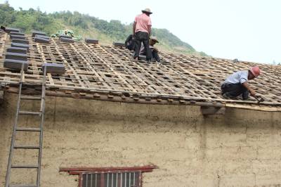 精准扶贫建设美丽乡村 7月11日,施工队正在对竹溪县水坪镇沙坝村农民的房屋的房顶进行改造。据了解,十堰市居房和城乡建设委员会等6个市直机关与企业与该村329户结成对子开展精准扶贫,建设美丽乡村。全村81户需要进行白墙坡屋顶改造的农舍已完成16户,精准扶贫工作队帮建的村办公房工程也到了收尾阶段。