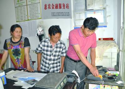 郑家铺村村民覃业政在金融服务站进行刷卡结付。 今年,位于鄂湘边界的刘家场镇郑家铺村的惠农金融服务站正式启用。该服务站配备刷卡自助终端机和便民服务柜台,周边两省4个村的村民可刷卡购买农资化肥及生活用品,是该镇借助金融服务平台优势,进一步强化便民服务的重大举措。( 张元银)