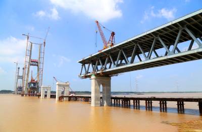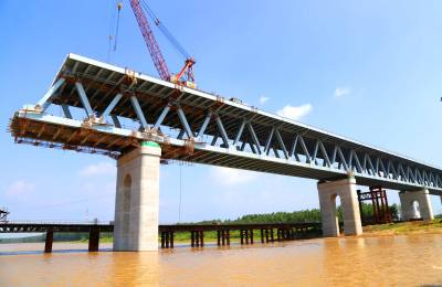 由于近期雨水多,给施工带来诸多困难,工人们抓住晴好天气快速施工,确保了钢梁架设安全质量进度稳步推进,预计8月中旬全部完成连续钢桁梁的架设任务。