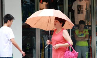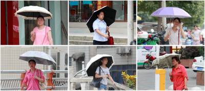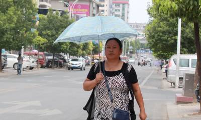 7月13日,在湖北省十堰市郧阳区,市民打着遮阳遮阳伞走在街头。当日湖北省十堰市09时05分发布高温橙色预警信号,全市大部分最高气温将达37摄氏度。 (郧阳区新闻宣传中心 曹忠宏 摄 )