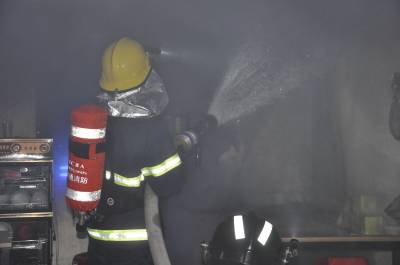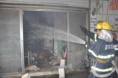 消防官兵立即破拆房门,发现店内多是桌椅、电器等物品,其中一张桌子及其上的杂物燃起熊熊大火,官兵们迅速用水枪浇射。10分钟后,大火被扑灭。