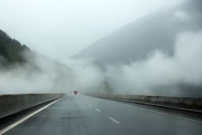 2015年6月30日,暴风雨袭击G50,雨雾中,一辆货车风雨兼程钻云破雾